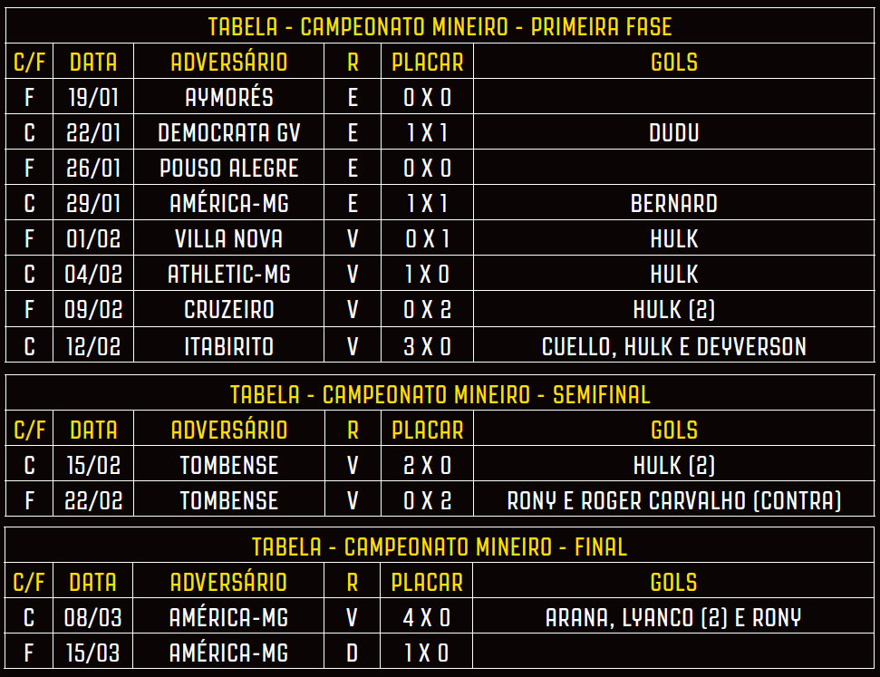 - Campanha do Galo: 12 jogos, 9 vitórias, 2 empates e 1 derrota, com 21 gols marcados e 8 gols sofridos.