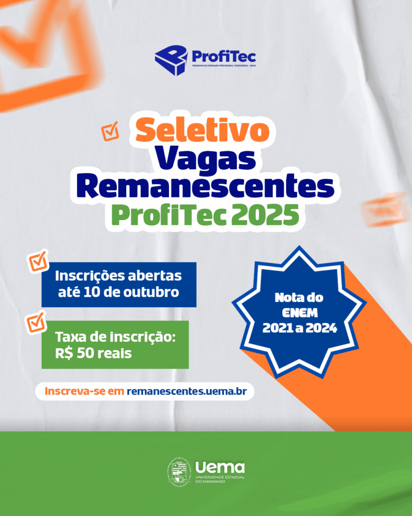 A Universidade Estadual do Maranhão (Uema) abriu inscrições para o Processo Seletivo de Vagas Remanescentes do Programa de Formação Profissional Tecnológica (ProfiTec) 2025. São 73 vagas em cursos presenciais distribuídas em Balsas, Bacabal, Barra do Corda, Santa Inês, Zé Doca e Presidente Dutra.