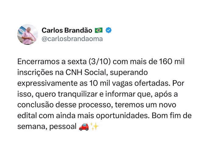 Diante da expressiva demanda, o governador Carlos Brandão anunciou que o governo estadual lançará um novo edital após a conclusão do processo seletivo atual. A medida visa ampliar o alcance do programa e permitir que mais maranhenses possam obter a Carteira Nacional de Habilitação (CNH) de forma gratuita.