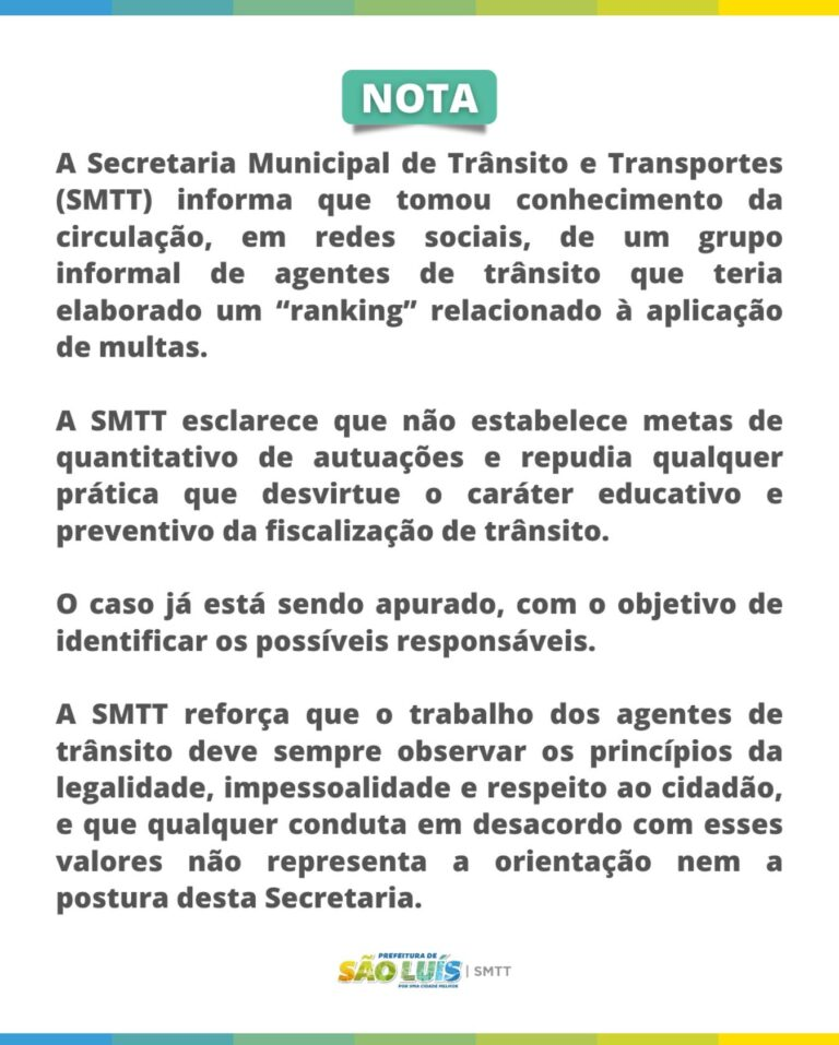 A Secretaria Municipal de Trânsito e Transportes (SMTT) de São Luís abriu uma apuração para verificar publicações que atribuem a agentes de trânsito a criação de um “ranking” informal de autuações. Em comunicado, a pasta informou que não adota metas de multas e que a fiscalização tem foco educativo e preventivo, não punitivo.