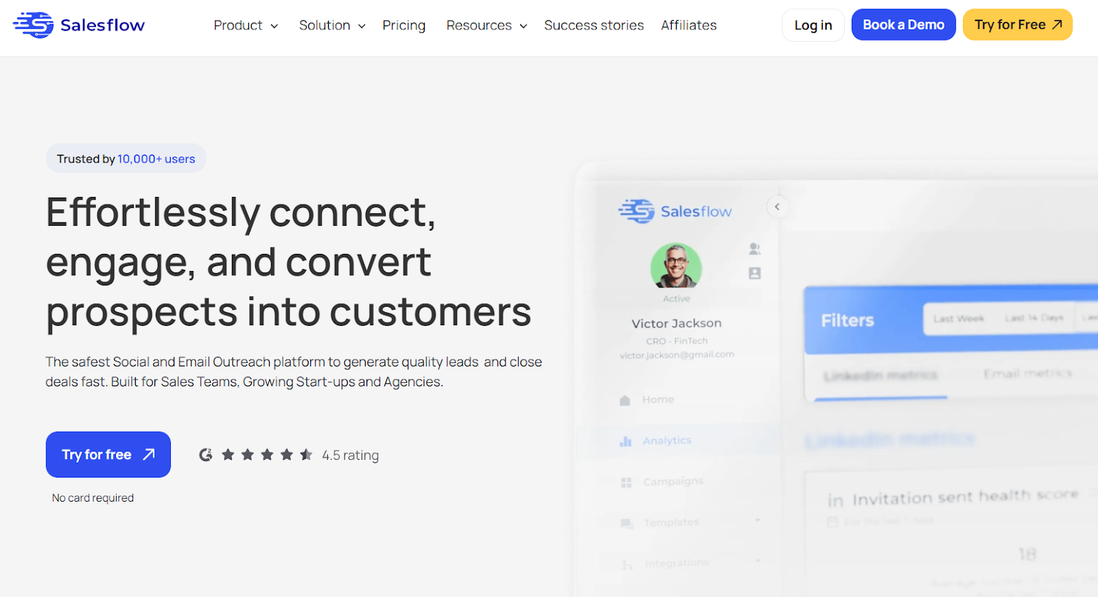 O Salesflow é uma solução robusta de automação do LinkedIn desenvolvida especialmente para times de vendas B2B e agências que gerenciam múltiplas contas ou clientes. A ferramenta permite criar, acompanhar e otimizar campanhas em larga escala, mantendo a segurança e a personalização de cada mensagem.