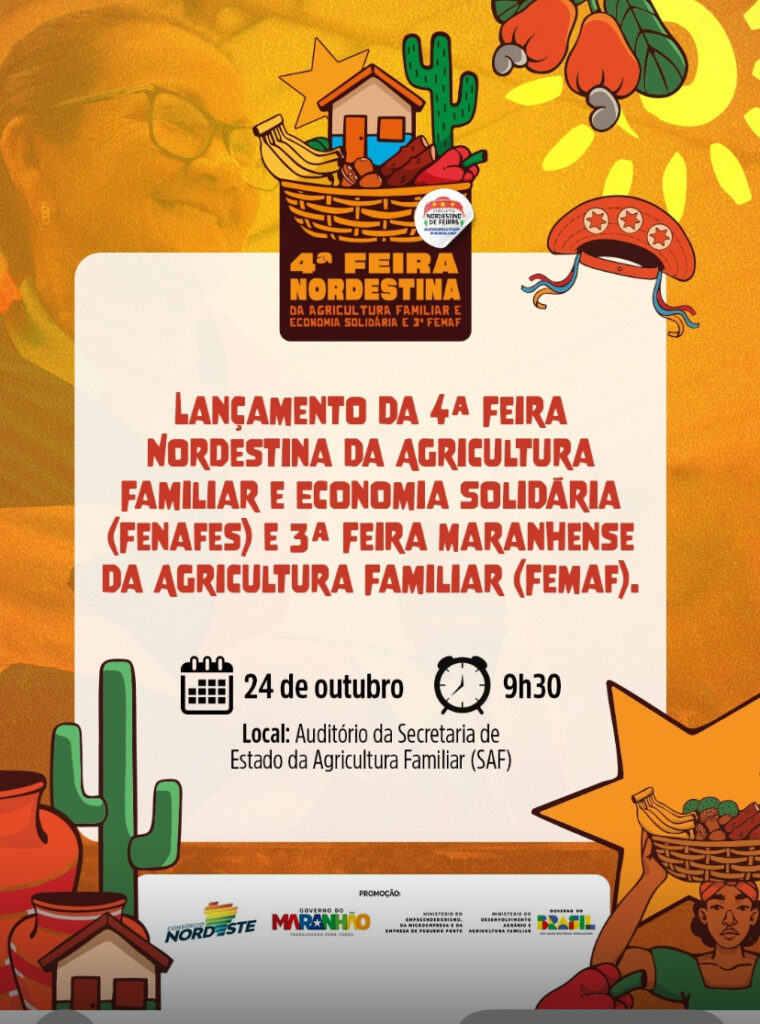 O Governo do Maranhão, por meio da Secretaria de Estado da Agricultura Familiar (SAF), realiza nesta sexta-feira (24), às 9h30, no auditório da SAF, em São Luís, o lançamento da 4ª Feira Nordestina da Agricultura Familiar e Economia Solidária (Fenafes) e da 3ª Feira Maranhense da Agricultura Familiar (Femaf).