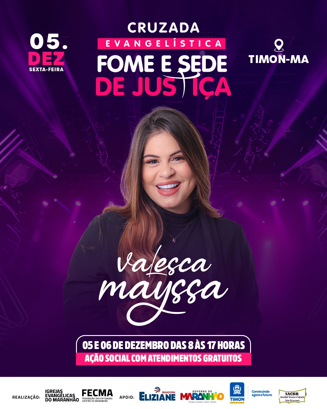 Em Timon, a programação contará com uma grande Cruzada Evangelística, incluindo show da cantora Valesca Mayssa, um dos maiores nomes da música gospel brasileira, na noite de sexta-feira, 05 de dezembro.