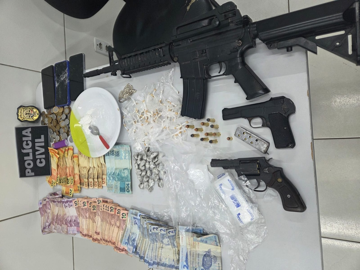 e um simulacro de fuzil, que, segundo a Polícia Civil, era utilizado em roubos na cidade.