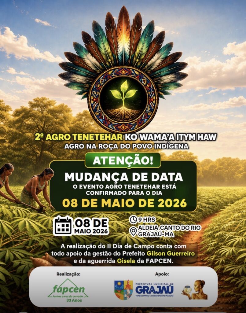 Contando com o apoio da Prefeitura municipal, a Aldeia Canto do Rio, município de Grajau (MA), sediará o 2º AGRO TENETHEAR, promovido pela FAPCEN, que através de doação da genética do projeto RENIVA, realiza vitrines tecnológicas dos principais cultivos dos povos tradicionais sem interferir em seu modo de vida tradicional, respeitando a cultura e a história dos povos tradicionais. Neste dia, líderes indígenas se farão presentes.